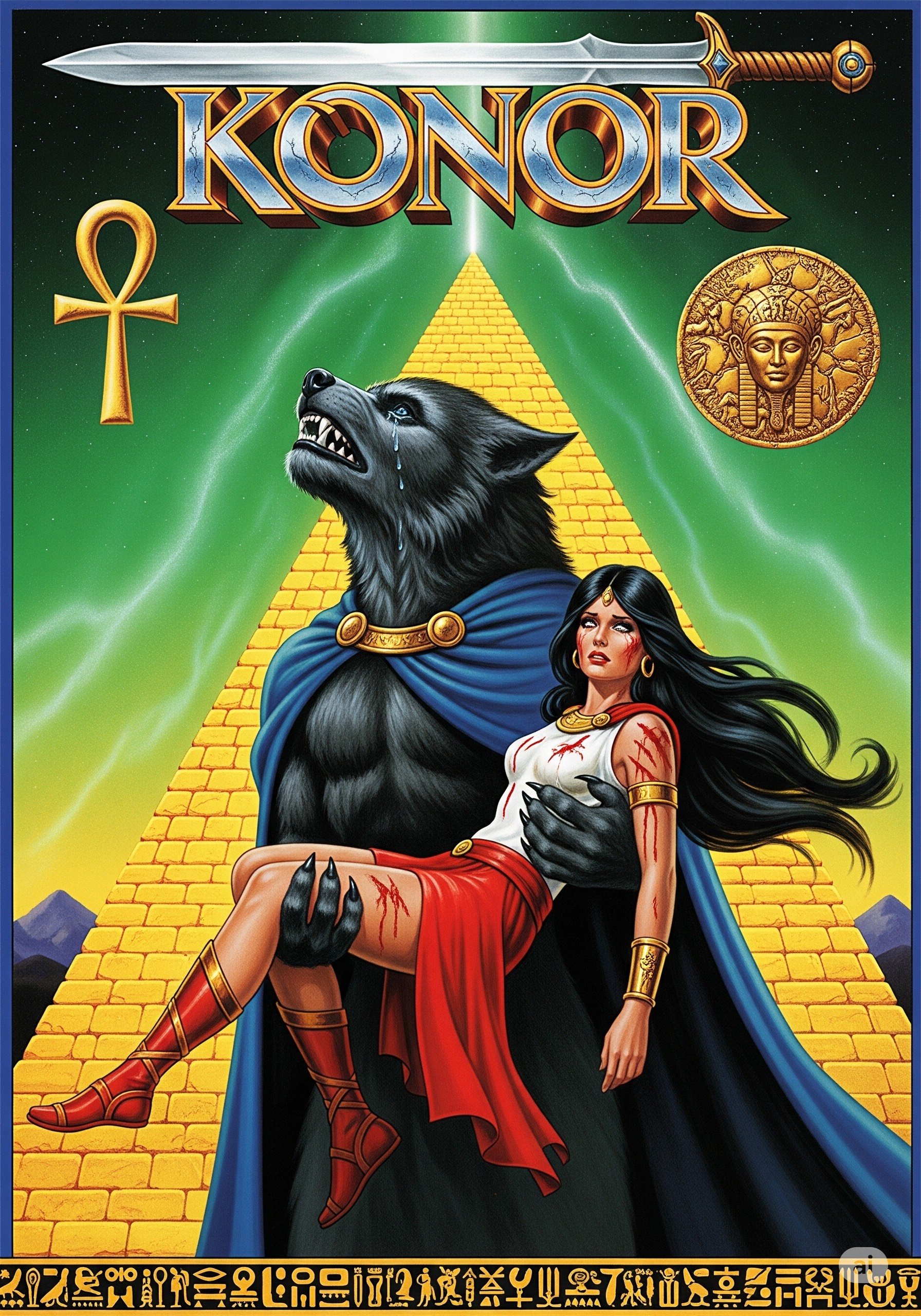 The artwork is rich with symbolism that blends classic fantasy tropes with the mystique of ancient Egypt. The central image of the weeping werewolf cradling the wounded sorceress is a powerful symbol of loyalty and subverts the "monster" archetype, portraying him instead as a compassionate guardian. This emotional core is framed by potent symbols: the golden pyramid represents ancient power and perhaps a place of sanctuary; the Ankh to the left is the Egyptian symbol for the Afterlife, hinting at themes of healing and resurrection; and the pharaonic medallion signifies a connection to a divine or royal magical lineage. The sword looming over the title reinforces the theme of conflict, making it clear that this moment of sorrow is the direct result of a great battle, fought for the very love the title proclaims.(JK)